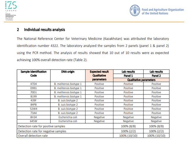 Ұсынылған есептің нәтижелері бойынша екі зертханада алынған нәтижелер мен қолданылатын барлық серологиялық және молекулалық биологиялық әдістер үшін күтілетін мәндер арасында 100% сәйкестігін көрсетті. Алынған нәтижелер зертхананың техникалық жарақтандырылуының жоғары деңгейін, мамандардың кәсіби біліктілігін және ВҰРО зертханасының бруцеллезді зертханалық диагностикалау саласындағы халықаралық талаптарға сәйкестігін растайды.